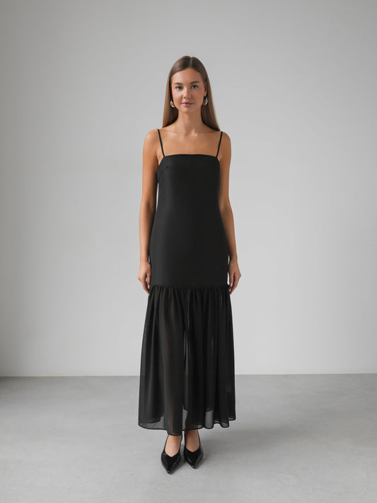 34% İndirimDekolteli Detaylı Siyah Halter Yaka Midi Elbise