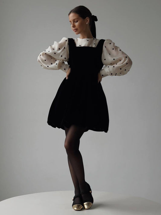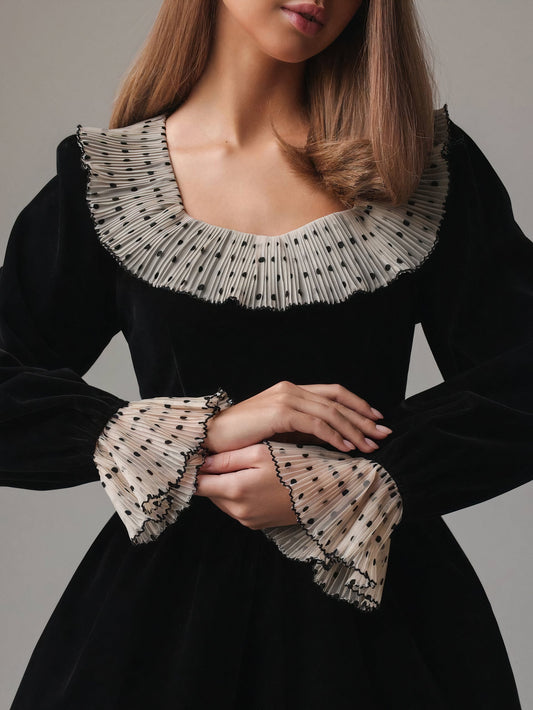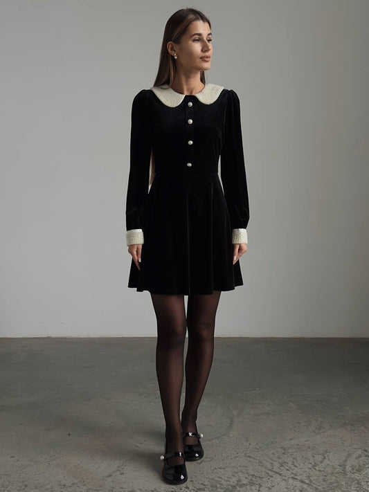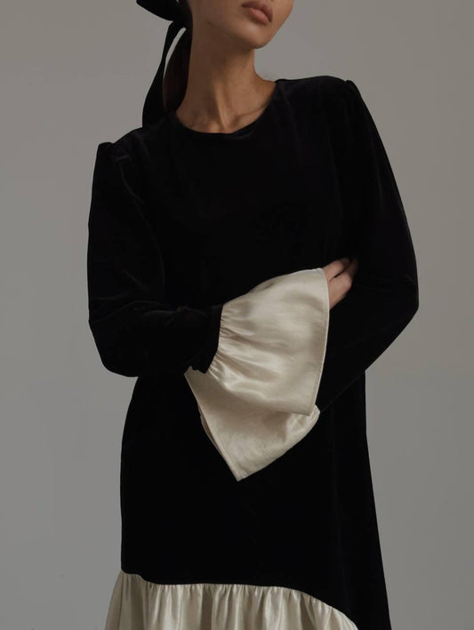 34% İndirimSiyah-Beyaz Kontrast Detaylı Kadife Elbise