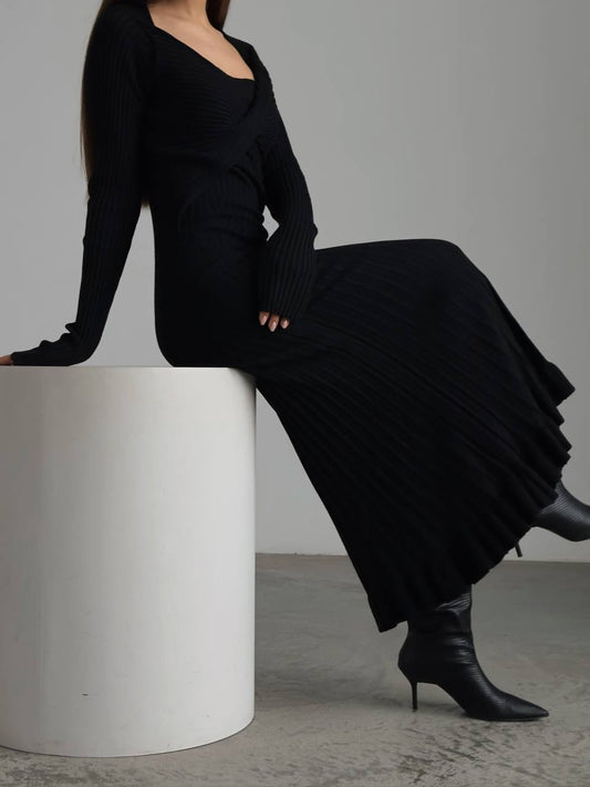 34% İndirimZarif Siyah Fitilli Triko Midi Elbise