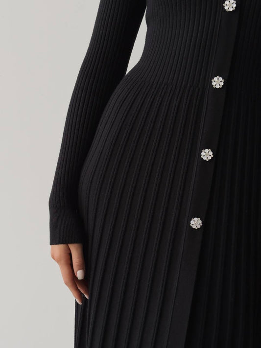 34% İndirimKristal Düğmeli Siyah Fitilli Triko Midi Elbise