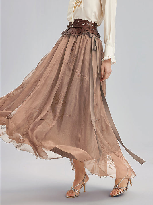 34% İndirimİşlemeli Çiçekli Pullu Şifon Etek