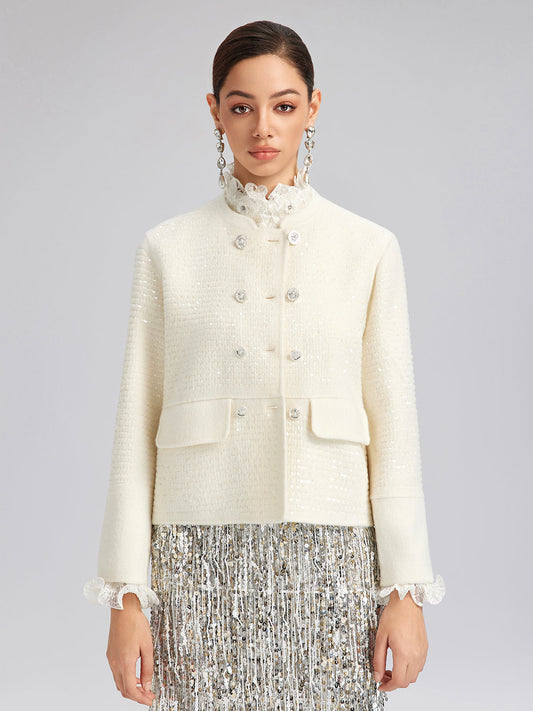 35% İndirimYün Pullu Nakışlı Yuvarlak Yaka Ceket (%100 Yün)