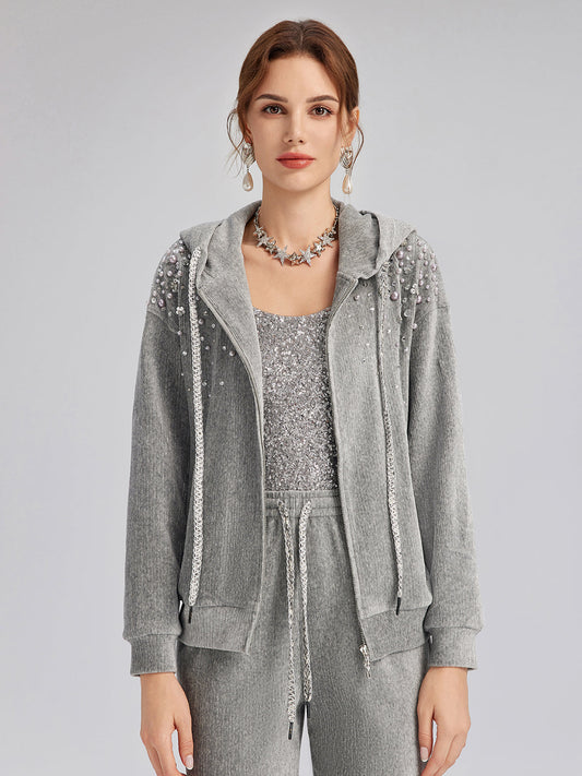 33% İndirimŞönil Fitilli Boncuklu Kapüşonlu Fermuarlı Ceket