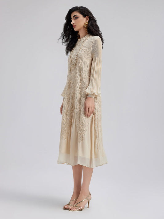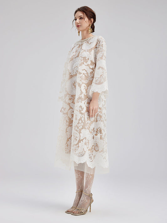 34% İndirimİnci Nakışlı Dantel Midi Elbise