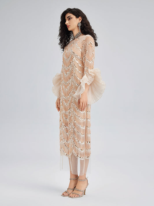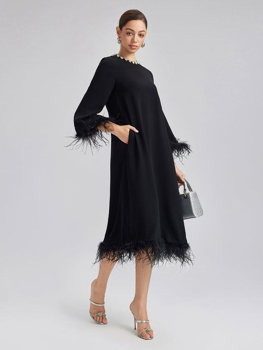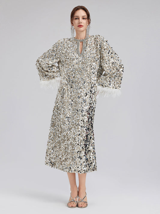 34% İndirimGöz Alıcı Pullu Tüy Kollu Elbise
