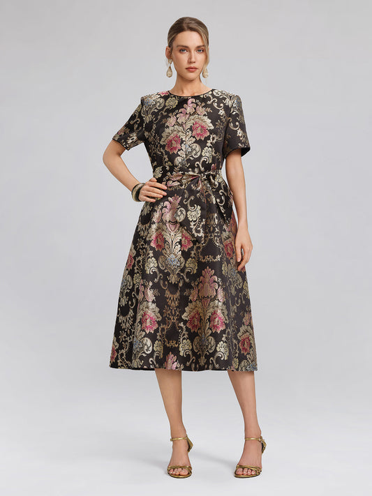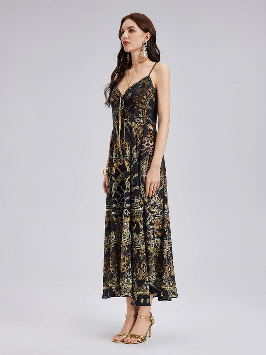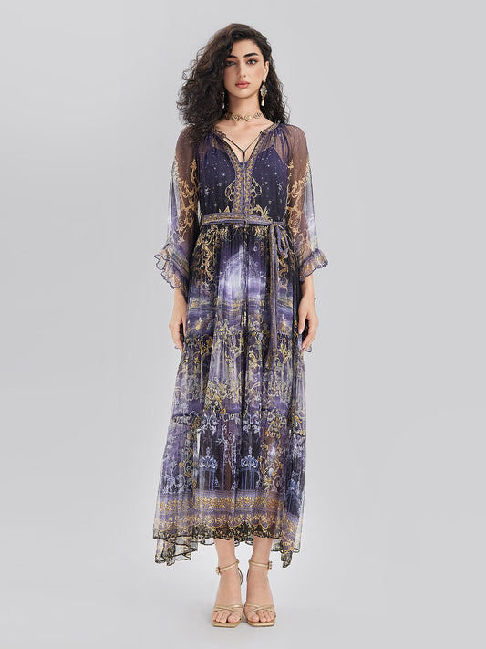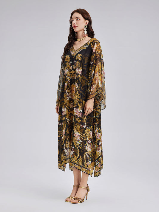 34% İndirimİpek Kristal Taşlı Barok Desenli Elbise