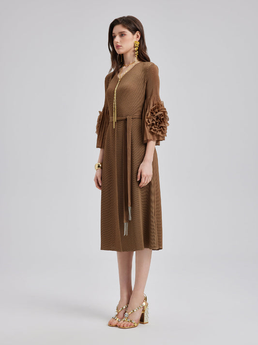 34% İndirimDokulu V Yaka Kemerli Uzun Elbise