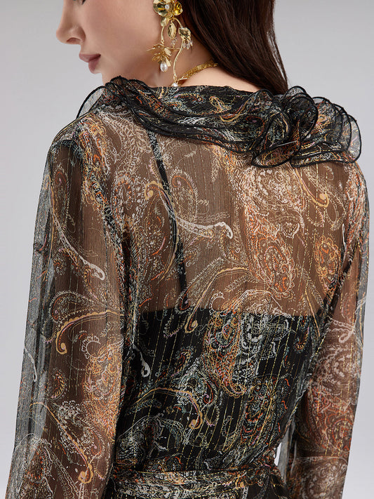 33% İndirimŞal Desenli Fırfırlı V Yaka İpek Elbise