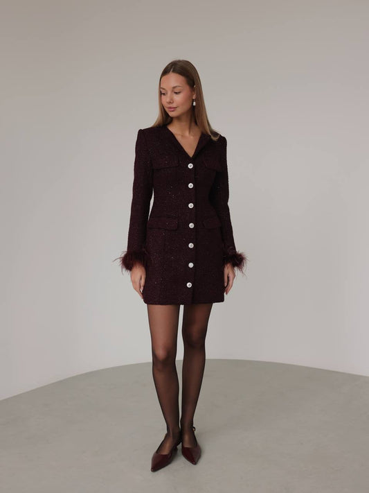 34% İndirimKoyu Bordo Tüy Manşetli Işıltılı Elbise