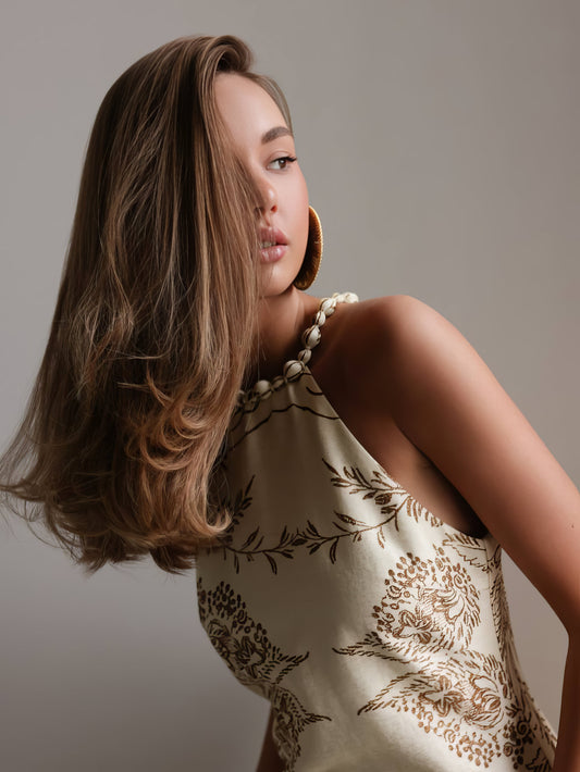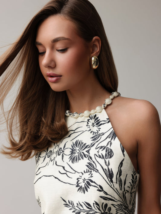 34% İndirimDökümlü Detaylı Bej Halter Yaka Maxi Elbise