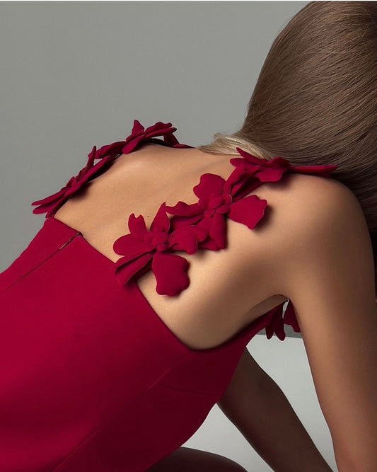 34% İndirimÇiçek Omuz Detaylı Zarif Kırmızı Mini Elbise