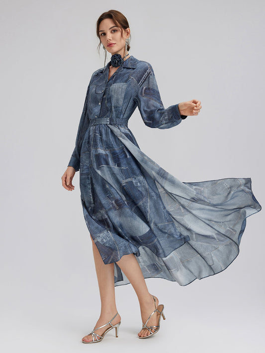 34% İndirimİpek Şifon Kot Desenli Gömlek