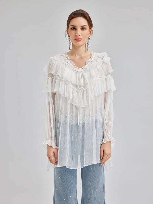 33% İndirimİpek Dantelli Fırfır Kenarlı Bluz (%100 İpek)