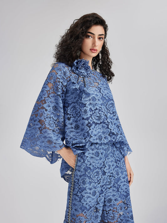 34% İndirimRetro Mavi Yıkamalı Dantelli Bluz