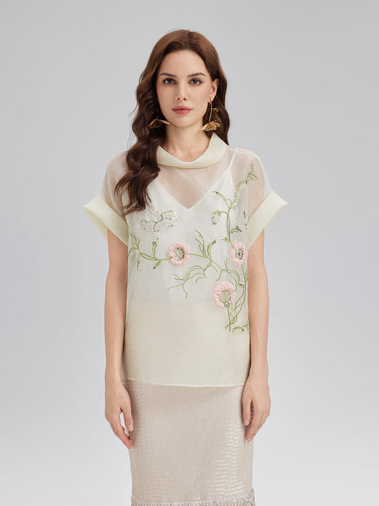 35% İndirimİpek 3 Boyutlu Pullu Nakışlı Kısa Kollu Bluz