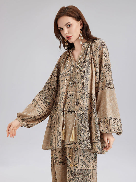 34% İndirimŞal Desenli Pamuk-Keten Rahat Tatil Bluzu