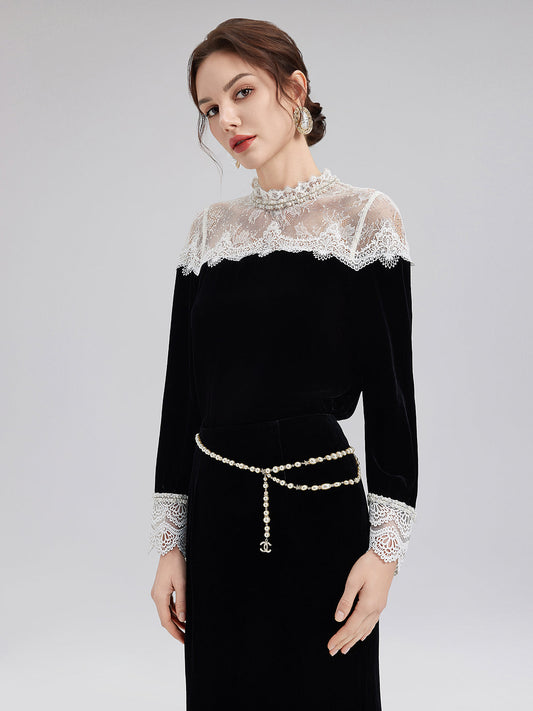 34% İndirimİpek Yakma Kadife Bağlamalı Yaka Bluz