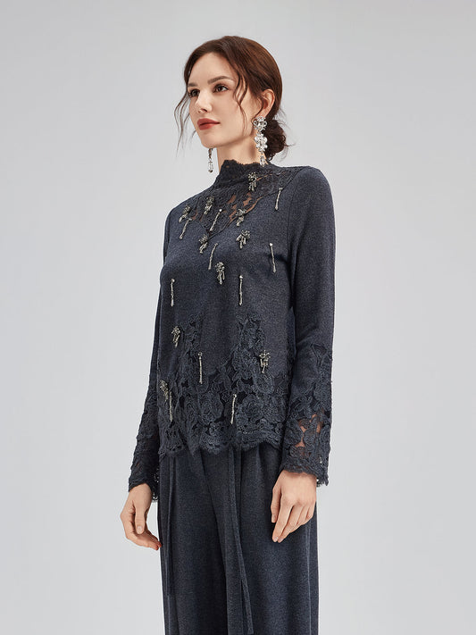 34% İndirimMerinos Yünü Dantel Boncuklu Triko Bluz