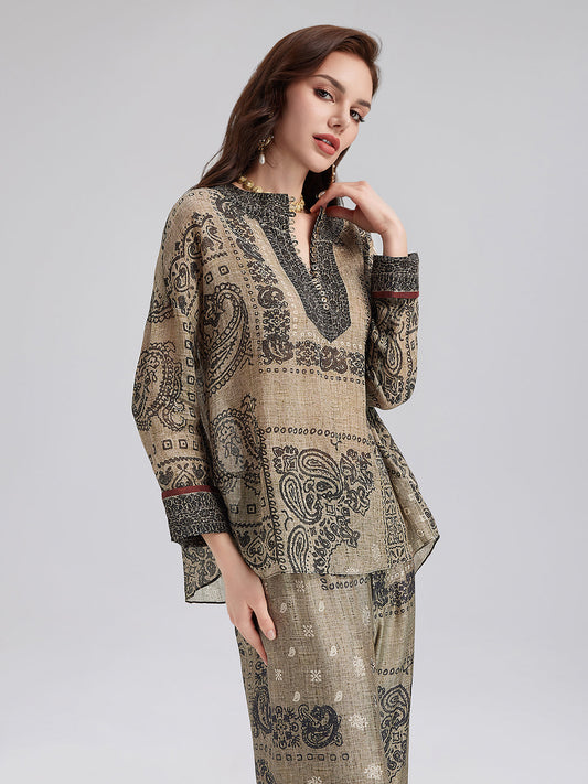 34% İndirimFransız Keten Görünümlü Şal Desenli Bluz