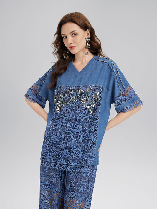 34% İndirimEl İşlemeli Boncuklu Dantel Parçalı V Yaka Bluz