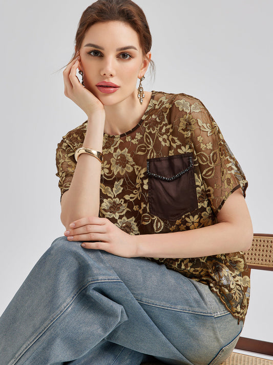 33% İndirimAltın Dantel Boncuklu Cepli Tişört