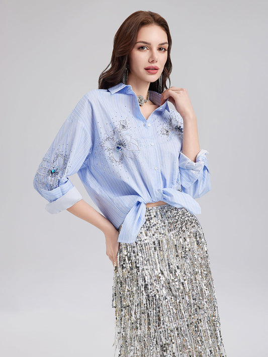 34% İndirimEl İşlemeli Boncuklu Çiçekli Çizgili Gömlek