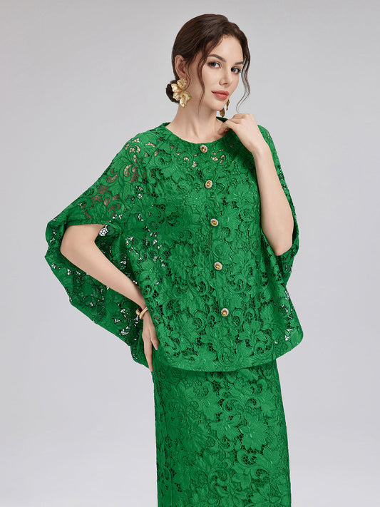 Dantel Aplike Mücevher Düğmeli Zümrüt Yeşili Bluz