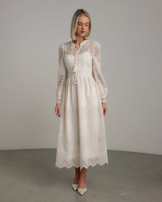 34% İndirimİnci Nakışlı Dantel Midi Elbise