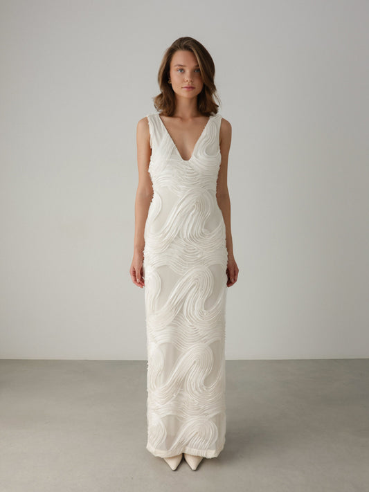 33% İndirimBeyaz Çiçek Aplike Midi Elbise
