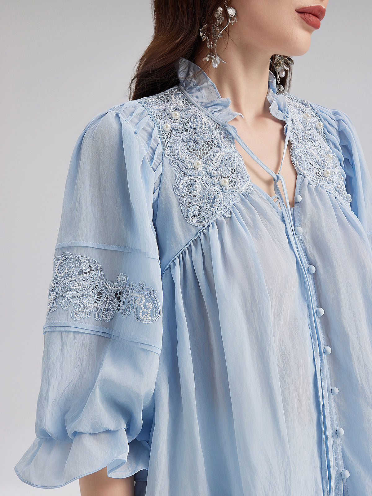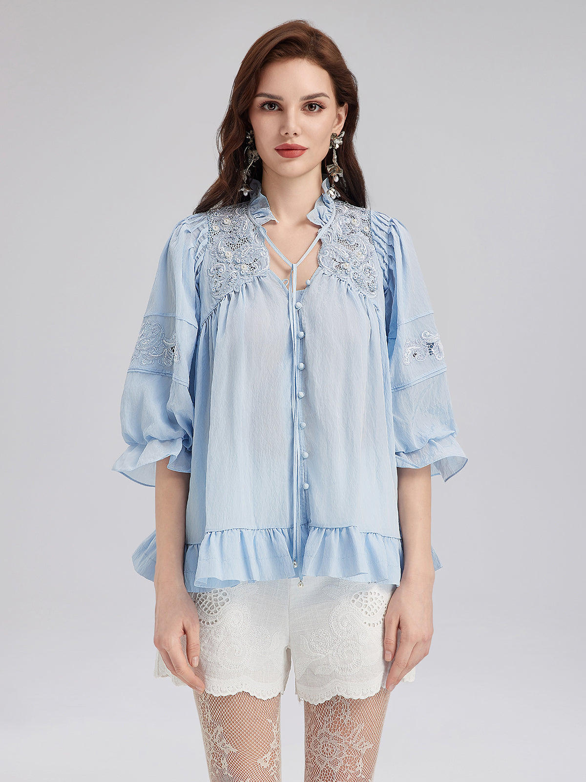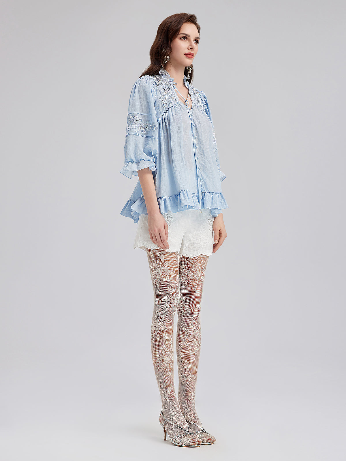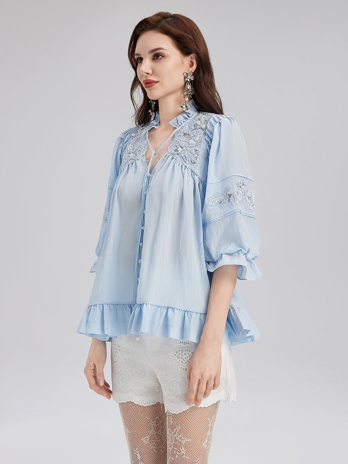 Boncuklu Dantel Nakışlı Volanlı Bluz