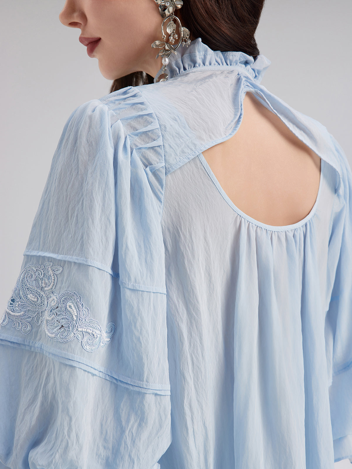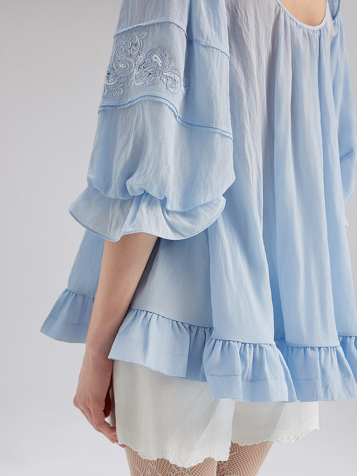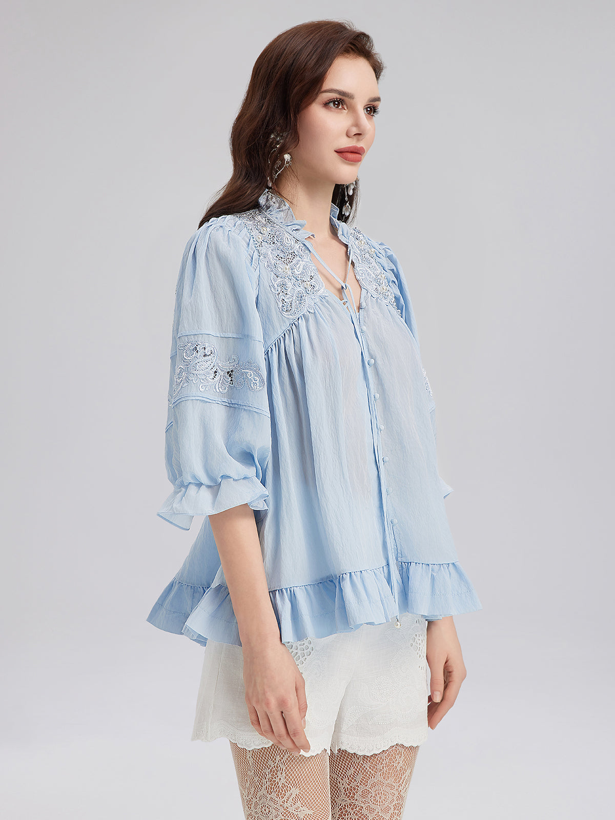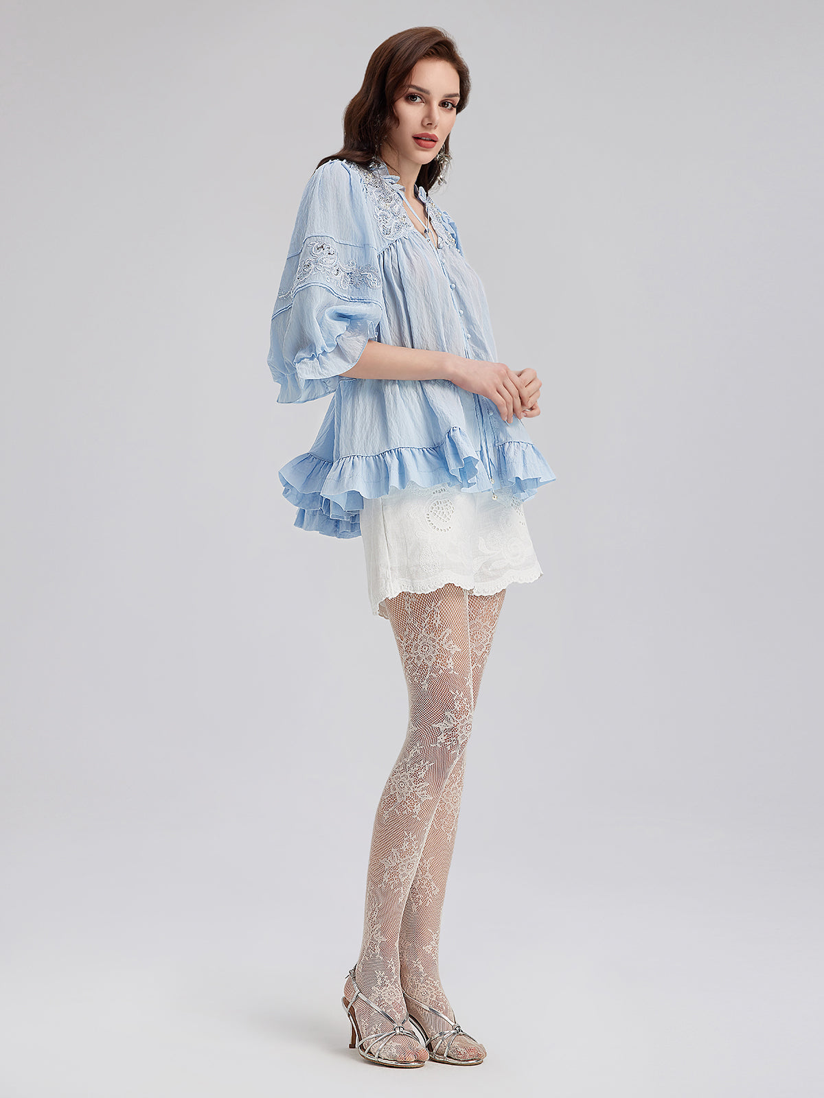 Boncuklu Dantel Nakışlı Volanlı Bluz