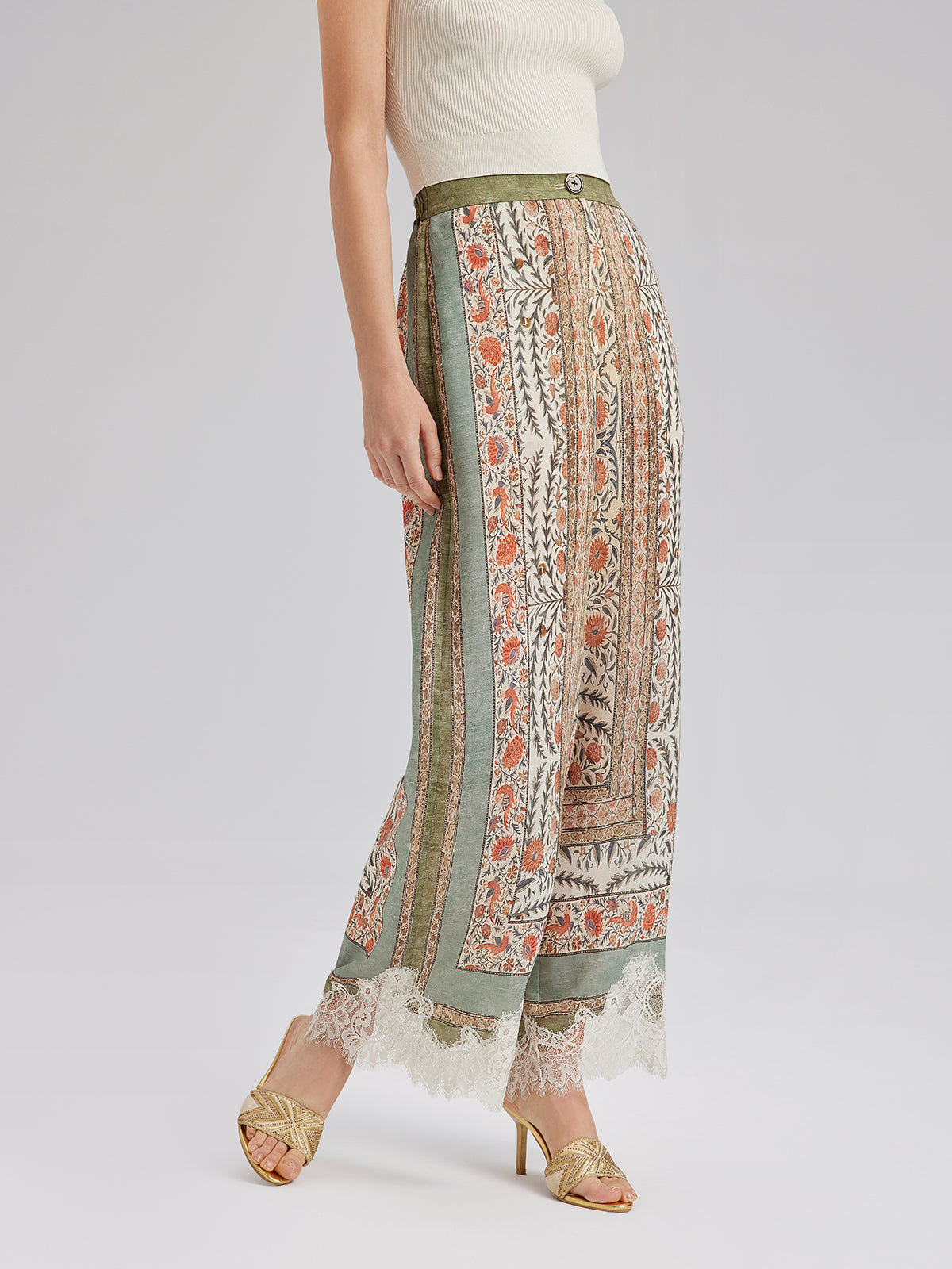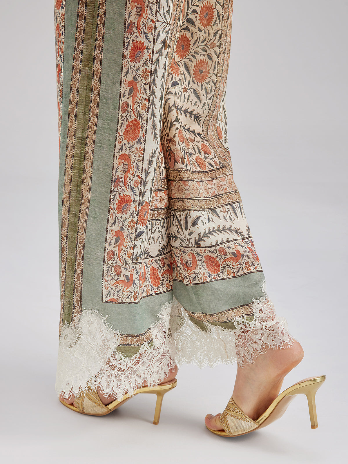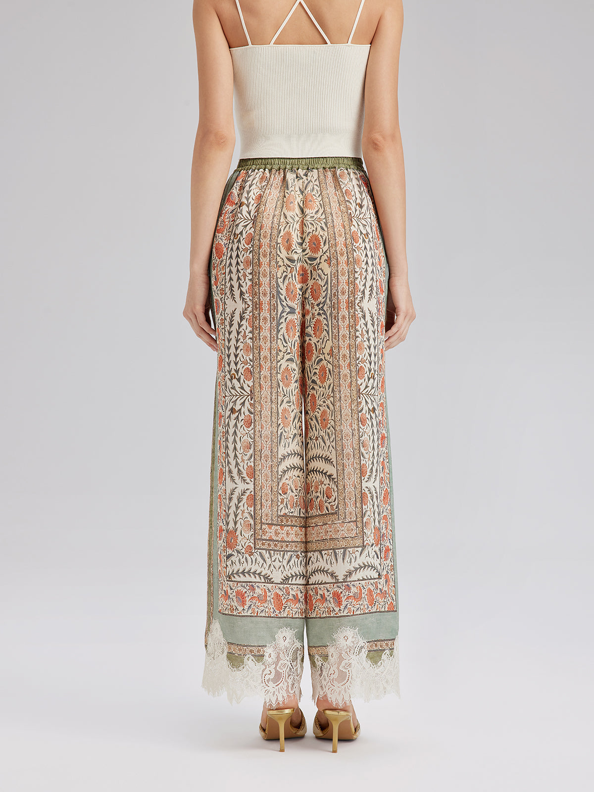 Bitki Desenli Dantel Kenarlı Yazlık Pantolon