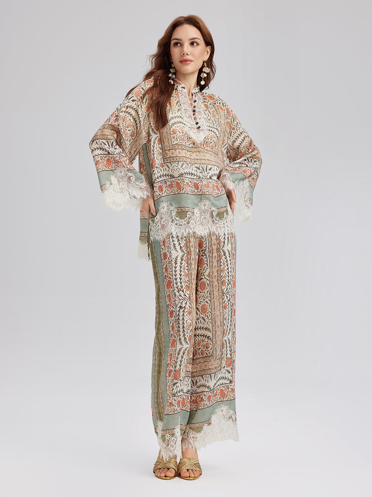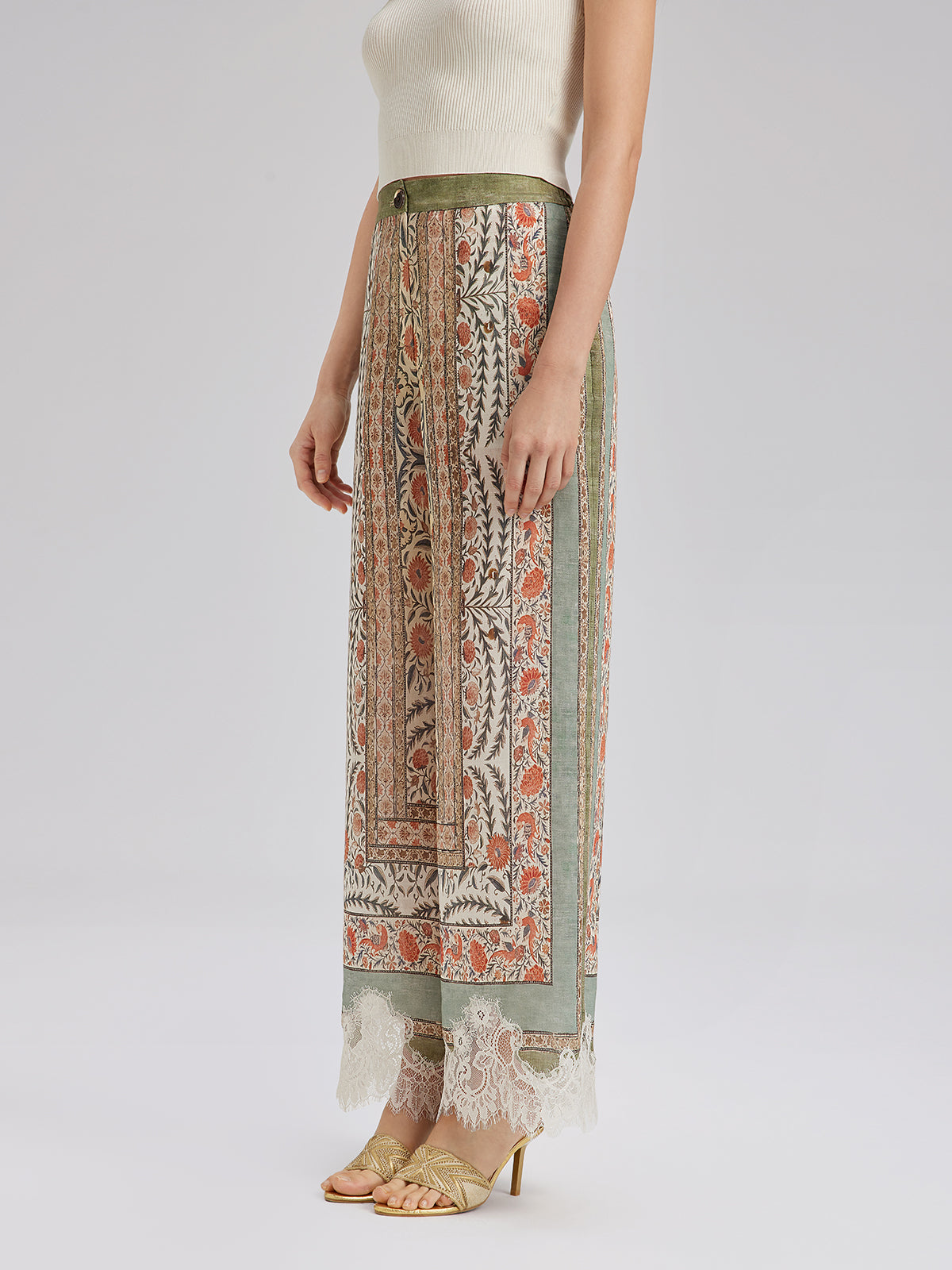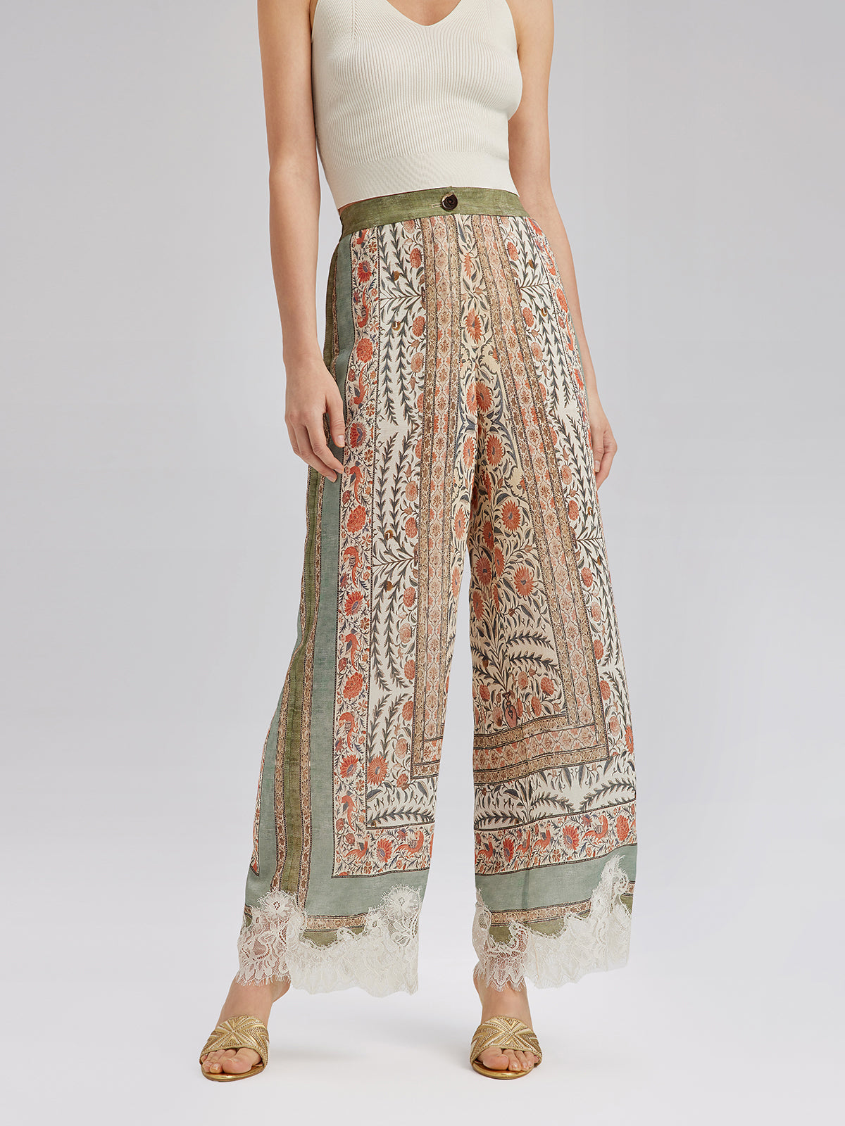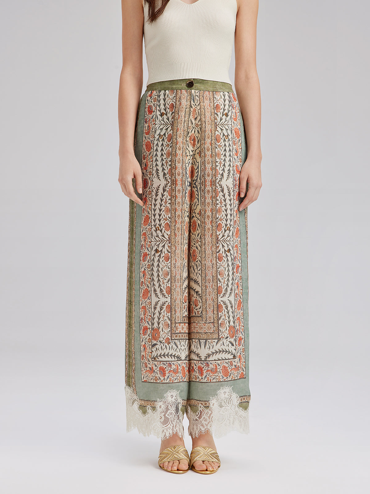Bitki Desenli Dantel Kenarlı Yazlık Pantolon
