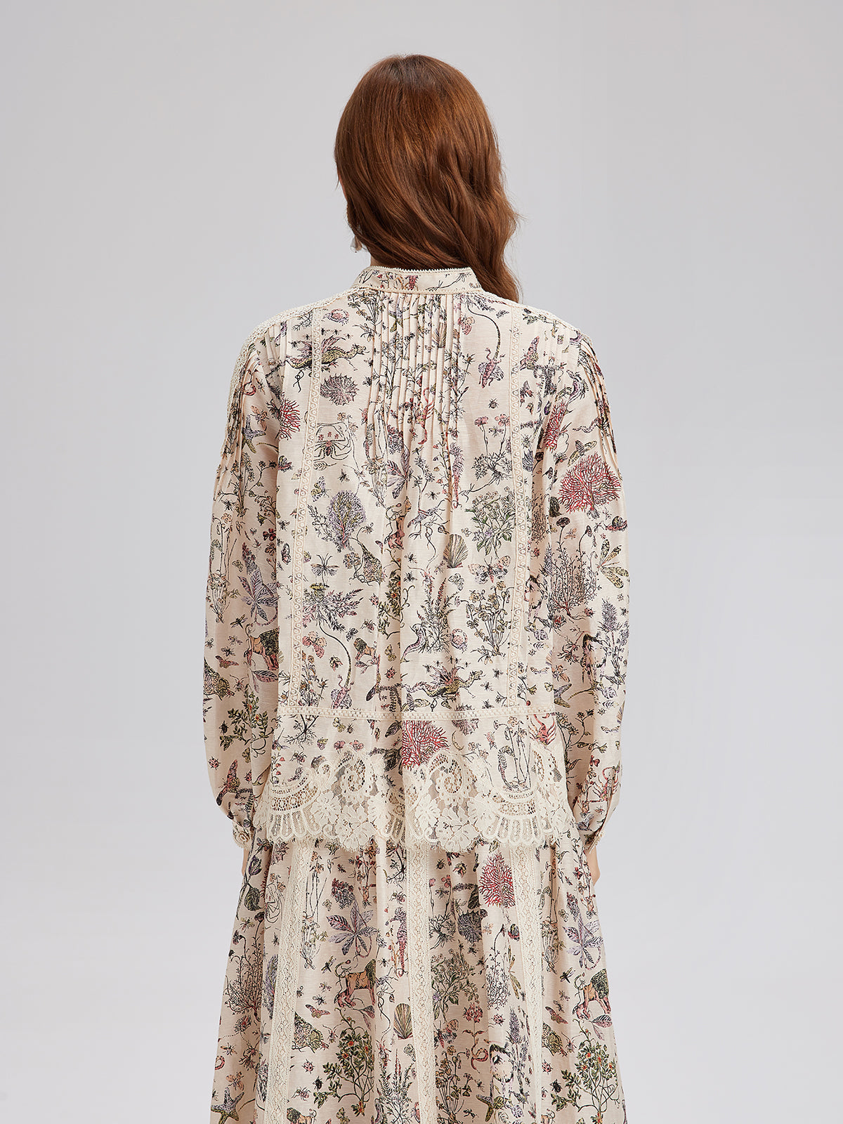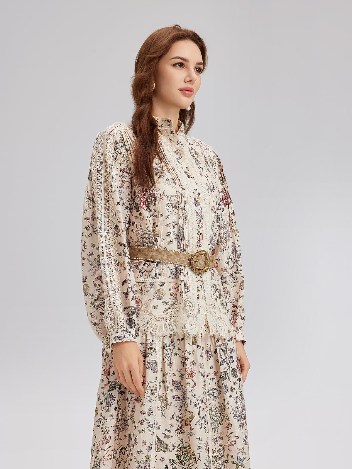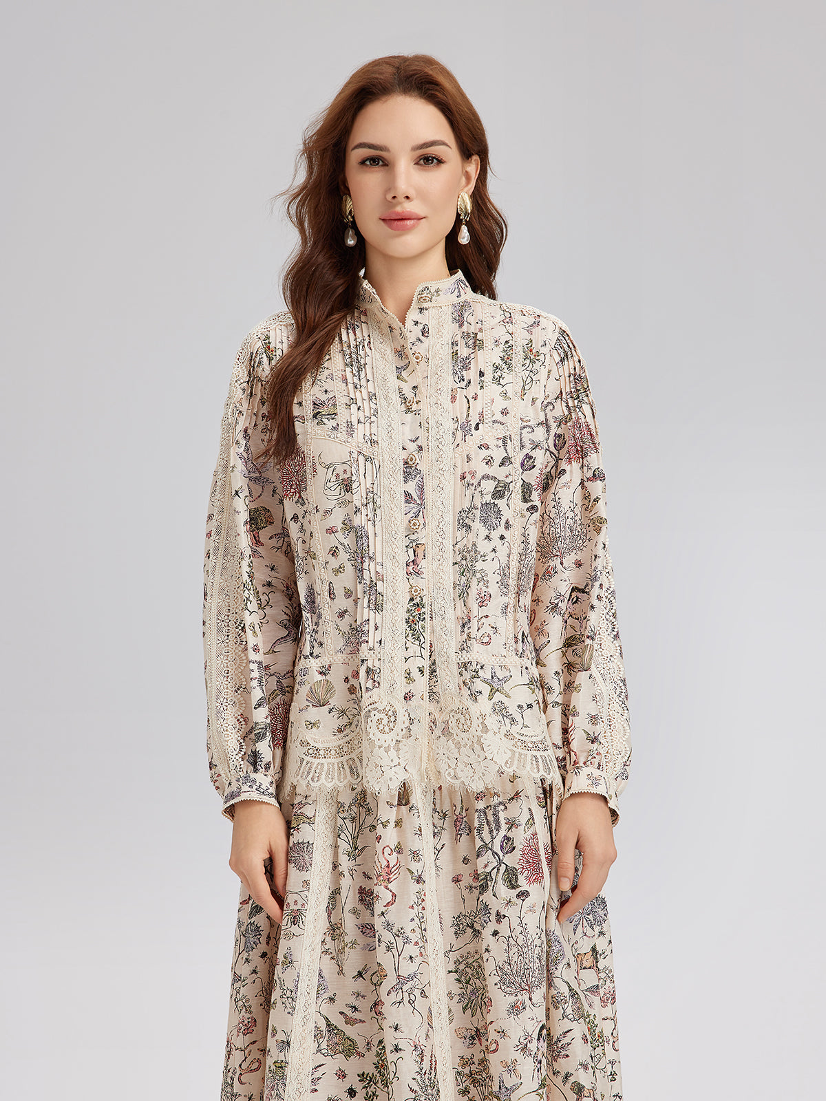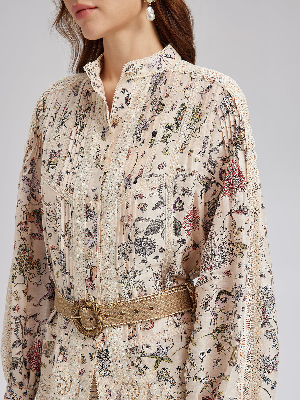 İpek-Keten Çiçekli Dantel Hakim Yaka Gömlek